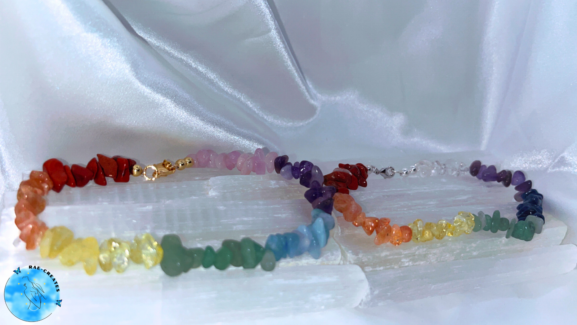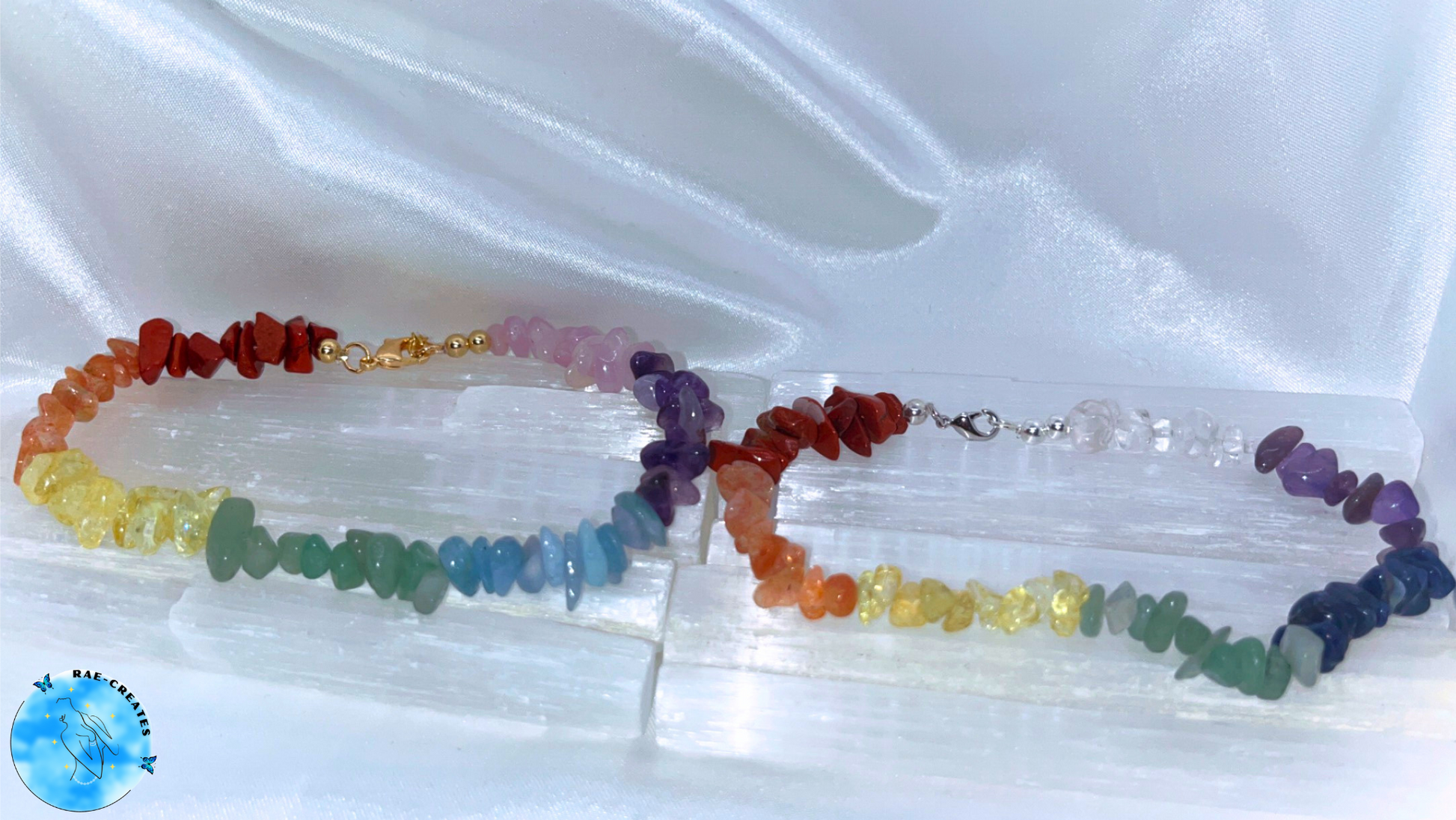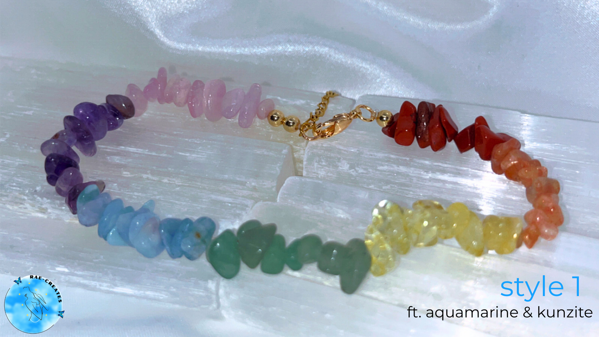 - Style 1: Red Jasper, Orange Sunstone, Yellow Citrine, Green Aventurine, Aquamarine, Amethyst, and Kunzite