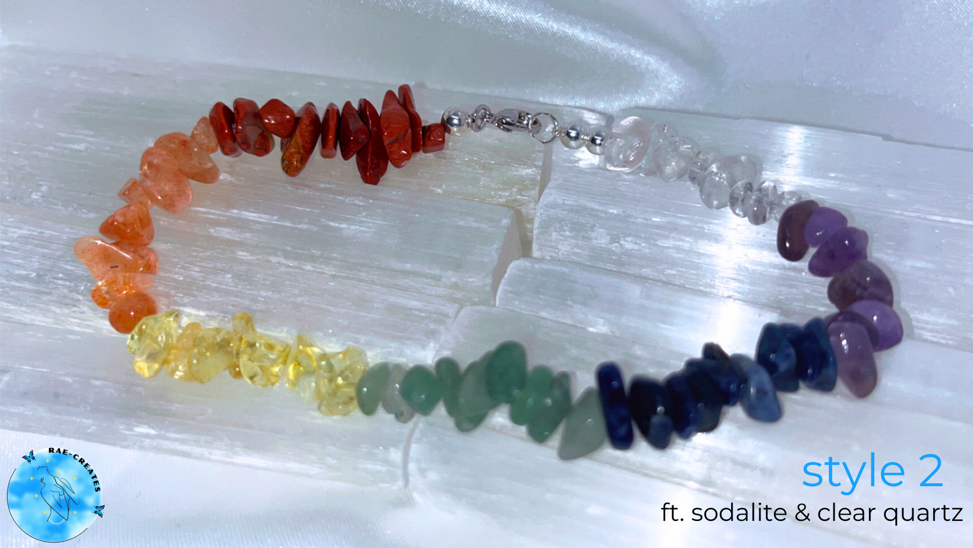 - Style 2: Red Jasper, Orange Sunstone, Yellow Citrine, Green Aventurine, Sodalite, Amethyst, and Clear Quartz